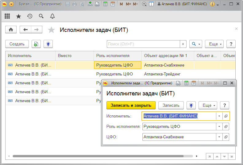 В регистре «Исполнители задач» необходимо указать исполнителей, которые будут согласовывать документы, их роли и объекты адресации.