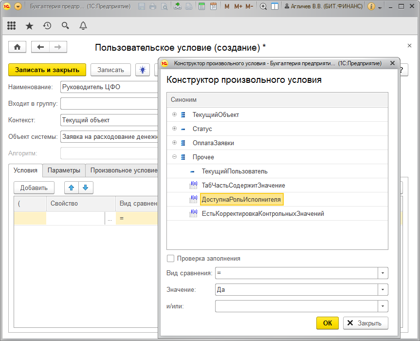 В справочнике «Пользовательские условия» необходимо добавить новый элемент справочника. Указать для него наименование, контекст=Текущий объект. В конструкторе произвольного условия выбрать «Прочее» – функция «ДоступнаРольИсполнителя», вид сравнения =, значение «Да».