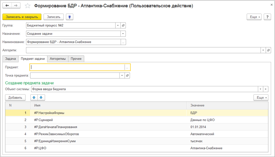 Динамические параметры В точке действия может быть указано значение динамического параметра, например, ЦФО = Атлантика, соответствующего именно этой точке. В этом случае можно иметь одно пользовательское действие, например «Формирование БДР», но несколько точек, соответствующих разным ЦФО. Динамические параметры задаются в алгоритме процесса (справочник «Алгоритмы процессов») на закладке «Параметры». Для того, чтобы при создании предмета задачи значения реквизитов брались из значения динамических параметров, необходимо в пользовательском действии на закладке «Предмет задачи» в правилах заполнения реквизитов указать #ПП.ИмяПараметра (к примеру #ПП.ЦФО)