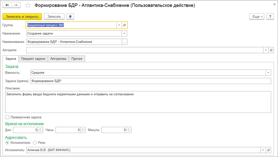 В форме элемента справочника «Пользовательские действия» указывается Наименование, Назначение (для целей алгоритма бизнес-процесса используется «Создание задачи» или «Подчиненный процесс»), Алгоритм, для которого создается пользовательское действие. Создание задачи Пользовательское действие с назначением «Создание задачи» содержит информацию о том, кто и что должен сделать на данном этапе. Исполнитель может определяться персонально (Иванов И.А.) или с учетом ролевой адресации («Руководитель ЦФО», «Руководитель отдела продаж»).