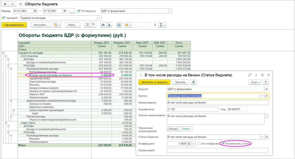 Реквизит «Коэффициент» означает, что сумма оборота по данной статье в отчетах будет выводиться с учетом этого коэффициента (будет умножена на коэффициент). Например, для статей расходов в бюджете доходов и расходов можно установить коэффициент «-1», тогда в отчет по бюджету суммы оборотов по данным статьям войдут со знаком «-» и в строке «Итого» будет рассчитана величина планируемой прибыли за период («доходы-расходы»).