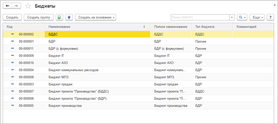 Для хранения списка бюджетов, которые составляются в организации, предназначен справочник «Бюджеты» (раздел «Бюджетирование»).