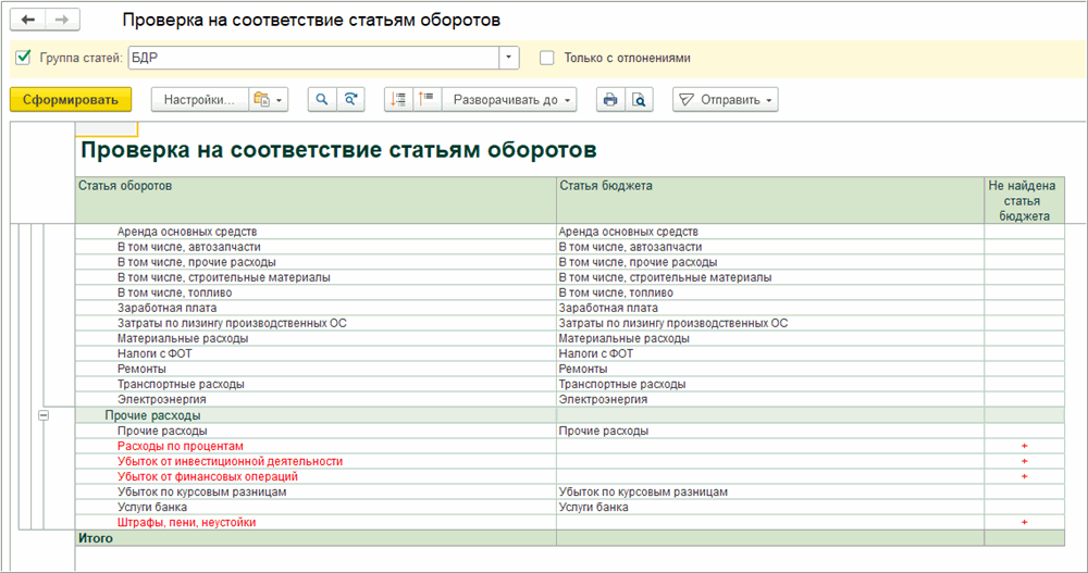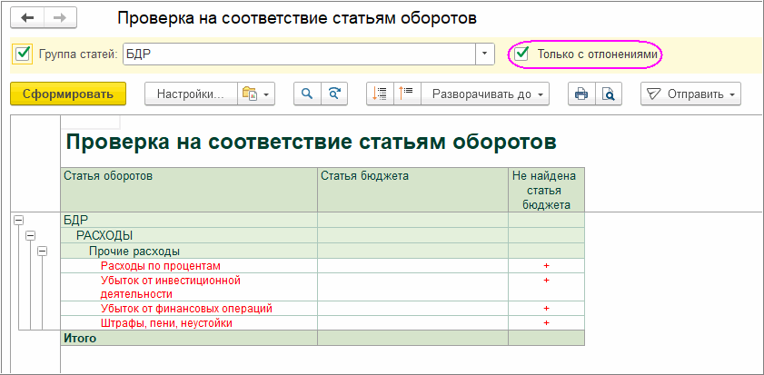 При установке флага «Только с отклонениями» в отчете будут отображены только статьи оборотов, для которых в бюджете не найдены соответствующий статьи бюджета.