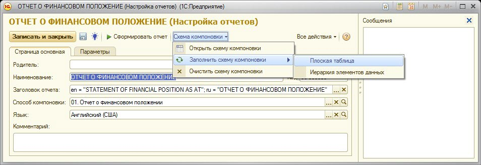 Заполнить схему компоновки – Плоская таблицы – при нажатии на данную кнопку схема компоновки данных заполняется, согласно выбранному элементу в реквизите «Способ компоновки» в виде плоской таблицы;
