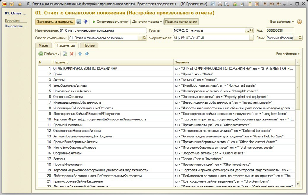 На закладке «Параметры» может задаваться ряд параметров, например, параметрические значения наименований показателей отчета на различных языках (перечень языков определяется содержимым справочника «Языки (БИТ)» - см. ниже). На макете (закладка «Макет») в этом случае параметры отображаются в квадратных скобках.