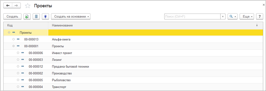 Примечание. В конфигурациях 1С: ERP и 1С: КА + БИТ.ФИНАНС используется справочник "Проекты" типовых конфигураций 1С: ERP и 1С: КА + БИТ.ФИНАНС.