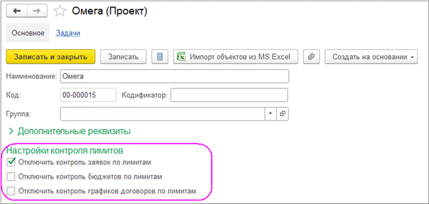 В справочнике «Проекты» можно отключить контроль лимитов для конкретных проектов путем установки флагов “Отключить контроль заявок по лимитам”, “Отключить контроль бюджетов по лимитам”, “Отключить контроль графиков договоров по лимитам”. Если один или несколько флагов установлены, то данный проект становится не лимитируемым для выбранных видов контроля. Сумма, введенная по такому проекту в заявке на расходование денежных средств, в графике договоров или, например, в бюджете ЦФО, не контролируется по бюджетам (БДР, БДДС и т.п.).