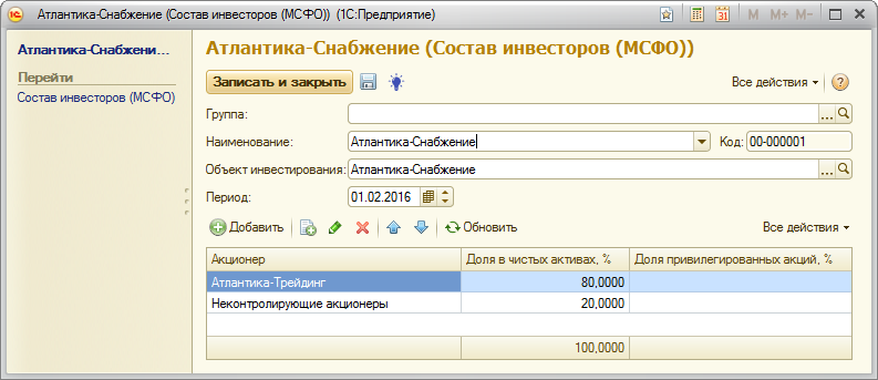 Суммарная доля по каждому объекту инвестирования равна 100% (для привилегированных акций может быть либо 100%, либо 0% - если привилегированные акции не выпускались). Корректировка итогового значение долей происходит автоматически за счет предопределенного значения «Неконтролирующие акционеры». Предопределенный элемент «Неконтролирующие акционеры» нужно вводить последним – тогда корректировка будет сразу отражать истинное положение владельцев.
