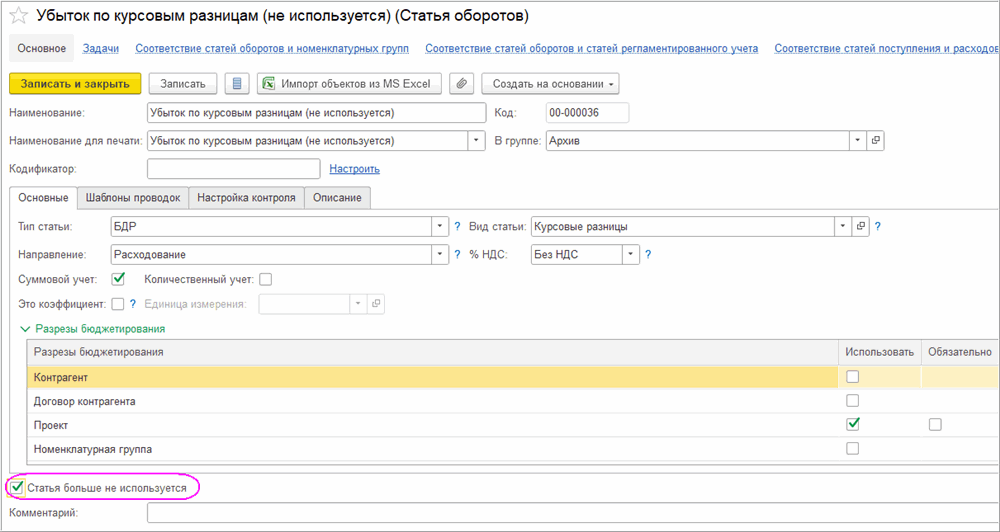В релизе 3.1.66 (для ERP и КА в релизе 3.2.46) в справочник «Статьи оборотов» добавлена возможность указать, что элемент справочника больше не используется (флаг «Статья больше не используется»), и скрыть такие элементы из списка и формы выбора данных элементов (флаг в справочнике «Статьи оборотов» - «Скрывать статьи, которые больше не используются»).