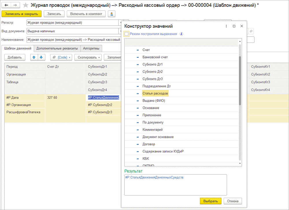 Далее в колонках и строках шаблона указываются правила заполнения значений реквизитов – это может быть ссылка на реквизит шапки или табличной части (например, счет учета, который будет указан пользователем в документе «Проформа»), фиксированное значение (конкретный счет учета, выбранный из плана счетов), пользовательская функция и другие источники.