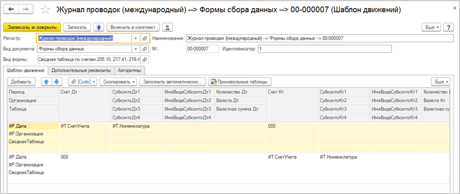 По кнопке «Заполнить автоматически» будут обработаны табличные части вида проформы и по кнопке «Выполнить» будет сформирована первая строка шаблона движений. В данной строке уже будут заполнены реквизиты табличной части так, как они должны быть представлены в шаблоне.