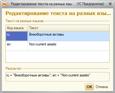 При разработке настроек отчетов на соответствующих языках (задании параметров настройки) в окне редактирования возникает предложение вписать значения параметров отчетов на всех заданных в справочнике языках, после чего необходимая для восприятия программой форматированная текстовая строка формируется автоматически. Например, для двух языков окно редактирования значения параметров выглядит так: