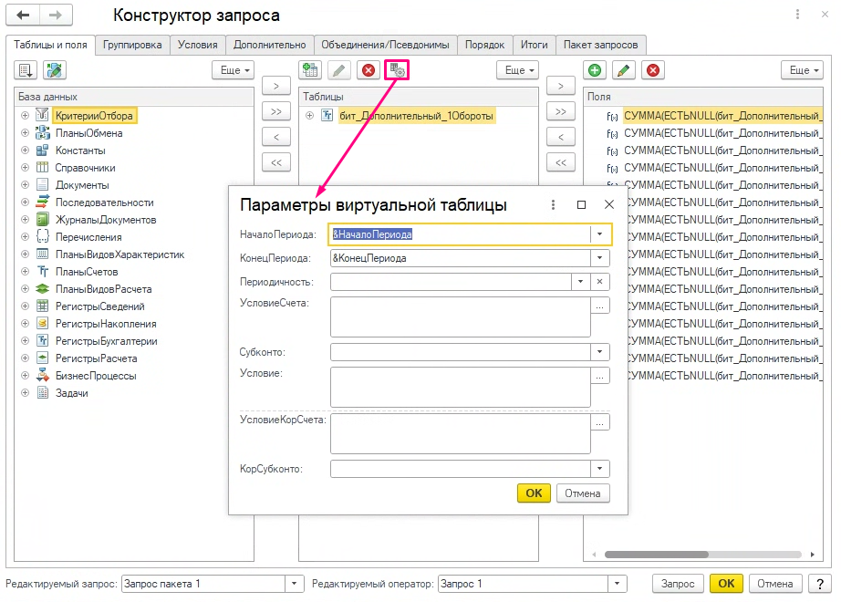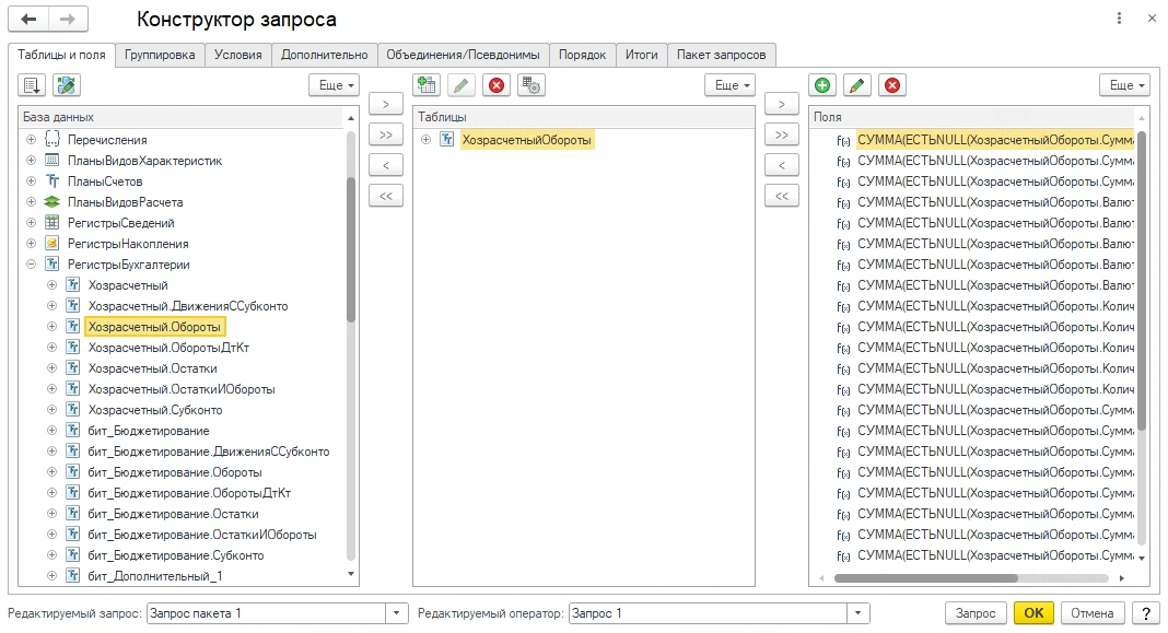 При нажатии на кнопку «Конструктор запроса» открывается стандартный помощник для формирования запроса.