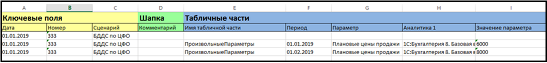 Примечание. При заполнении файла Excel необходимо учесть, что данные табличных частей объектов должны указываться в отдельных строках, после строки с реквизитами шапки, при этом каждая строка должна повторять данные шапки. Если требуется загрузка только данных табличных частей, то все равно необходимо их вводить начиная со второй строки. Пример настройки загрузки данных в документ «Установка значений произвольных параметров»: