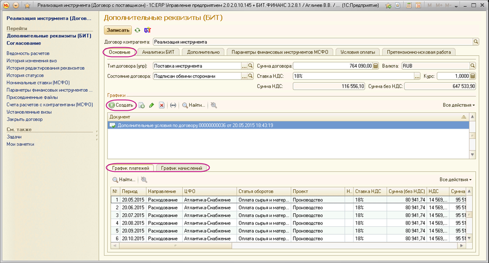 Созданные графики отображаются в договорах на закладке «Основные» в группе «Графики» отдельно по каждому документу «Дополнительные условия по договору».