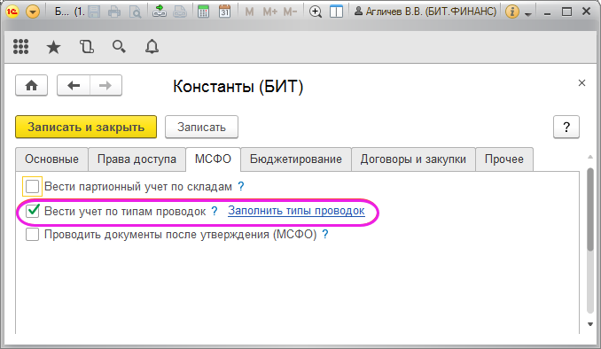 Для включения данного функционала в Константы (БИТ) (Раздел «Настройки (БИТ)» - «Константы (БИТ)») требуется установить флаг «Вести учет по типам проводок»: