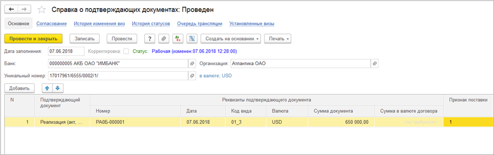 На основании Регистрации договора ВЭД может быть создан документ «Справка о подтверждающих документах».