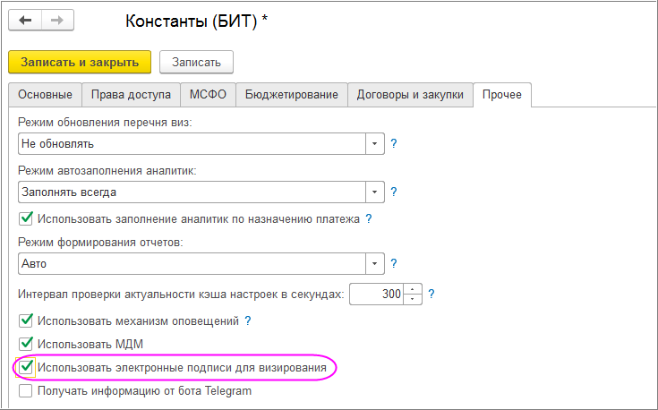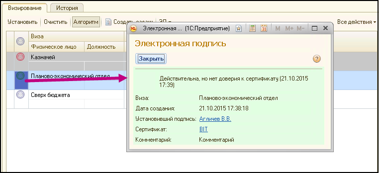 В системе БИТ.ФИНАНС реализовано визирование с использованием электронно-цифровой подписи. В Константы (БИТ) включена константа «Использовать электронные подписи для визирования», которая доступна только при установленной константе типовой конфигурации 1С «Электронная подпись» (Раздел Администрирование – Общие настройки).