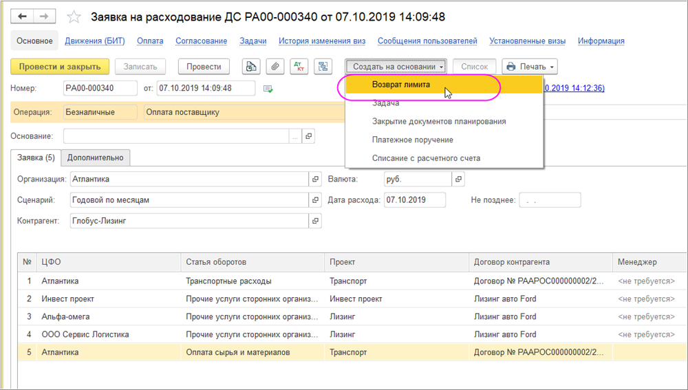 При проведении данный документ сформирует сторнирующие записи. Таким образом, лимиты, списанные заявкой, будут восстановлены.