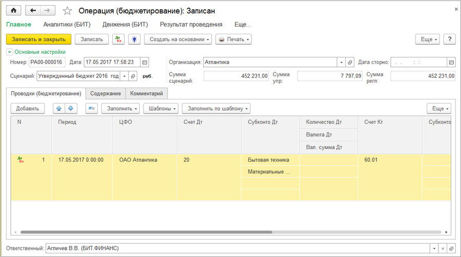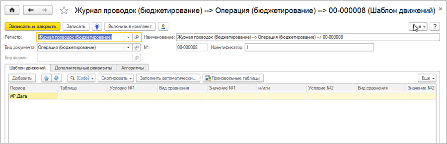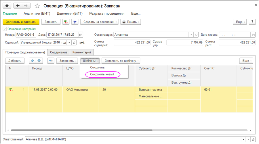 В документе «Операция (бюджетирование)» реализована возможность использования шаблонов проводок. Для сохранения проводки в шаблон служит кнопка «Шаблоны – Сохранить новый»: