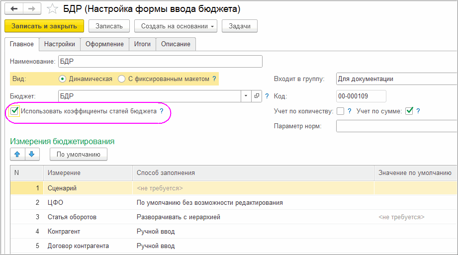 Для того, чтобы в документе в группах статей оборотов итоги рассчитывались с учетом коэффициентов, заданных в справочнике «Бюджеты», в справочнике «Настройки форм ввода бюджета» нужно установить флаг «Использовать коэффициенты статей бюджета».