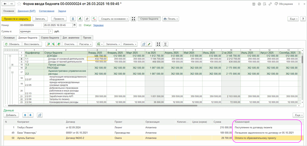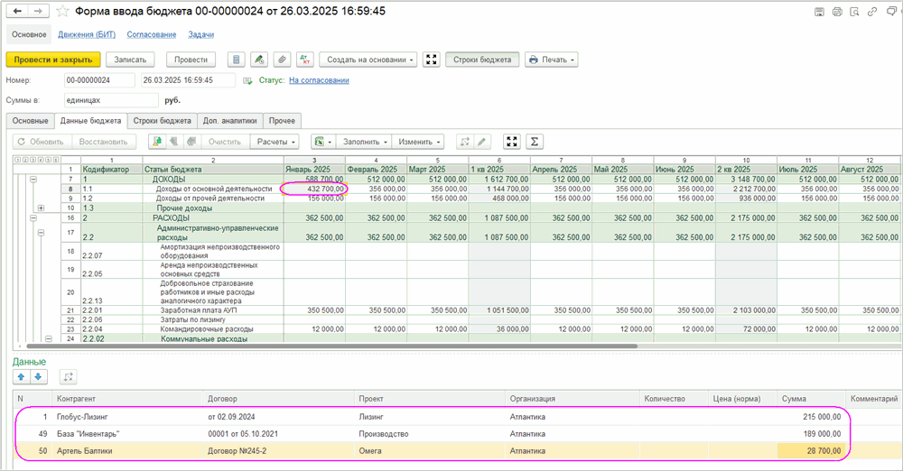 При заполнении ячейки в табличной части «Данные» появляется строка с указанной суммой, в которой можно заполнить нужные аналитики: контрагента, договор, ЦФО и т.д. При добавлении новой строки с суммой дохода или расхода, общая сумма в ячейке формы бюджета увеличится.