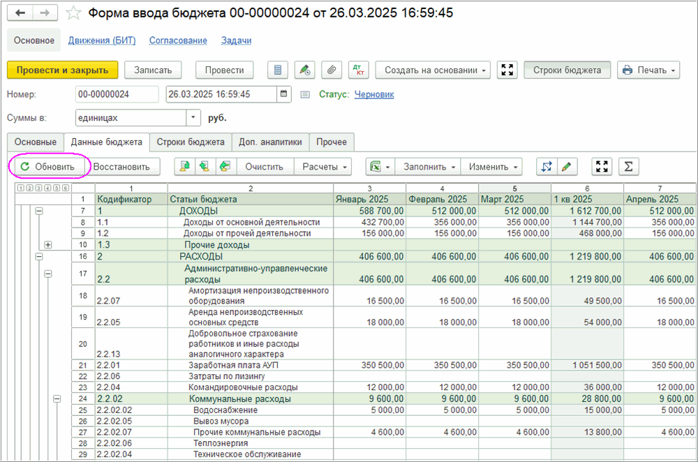 Кнопка «Восстановить» предназначена для восстановления дерева в табличной части по данным справочников «Статьи оборотов» и «Бюджеты», если в них произошли какие-либо изменения после того, как документ начали заполнять.