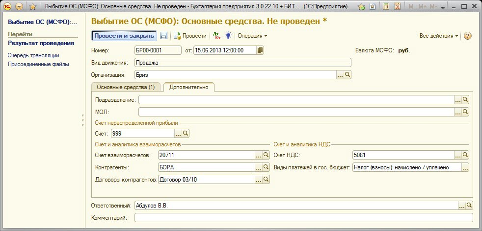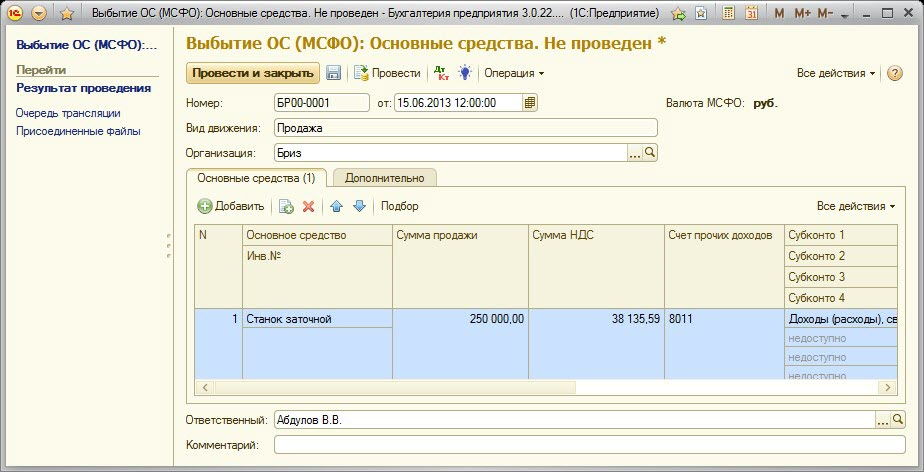 Для отражения операций по продаже основных средств предназначен вид движения «Продажа ОС» в документе «Выбытие ОС (МСФО)». В табличной части указывается основное средство, которое выбывает, счет списания балансовой стоимости с аналитикой, счет отражения дохода от продажи, сумма продажи и сумма НДС.