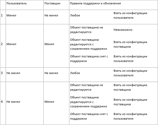 Модификация алгоритма обновления с помощью правил поддержки Пользователь может модифицировать приведенный алгоритм обновления с помощью правил поддержки, которые можно установить для каждого объекта метаданных. Необходимость в этом может возникнуть, если пользователь собирается самостоятельно выполнять дальнейшую модификацию объекта на себя, и ему неинтересны изменения, вносимые поставщиком. Частный случай - пользователю вообще не требуется данный объект, и он хочет его удалить. Существуют три правила поддержки объекта метаданных: «Объект поставщика не редактируется» - пользователь не может изменять объект поставщика. Основное предназначение этого правила будет описано ниже, но пользователь может установить его с целью страховки от случайных изменений. При обновлении такие объекты будут полностью заменяться на объекты поставщика новой версии. «Объект поставщика редактируется с сохранением поддержки» - основное правило. В этом случае алгоритм объединения в точности совпадает с описанным. «Объект поставщика снят с поддержки» - пользователь не хочет выполнять дальнейшие обновления данного объекта. Для того чтобы удалить объект поставщика, предварительно ему необходимо установить данное правило.