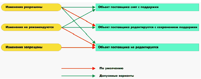 Ограничения действий пользователя со стороны поставщика с помощью правил поставки Поставщик может ограничить возможные изменения пользователя с помощью правил поставки, которые можно устанавливать для каждого объекта метаданных. Данная возможность призвана ограничить возможные изменения конфигурации поставщика, нарушающие логику ее работы, после которых дальнейшая поддержка конфигурации теряет смысл. Существуют три правила поставки: Далее приводятся правила поддержки (по умолчанию и доступные для выбора пользователем), соответствующие различным правилам поставки.
