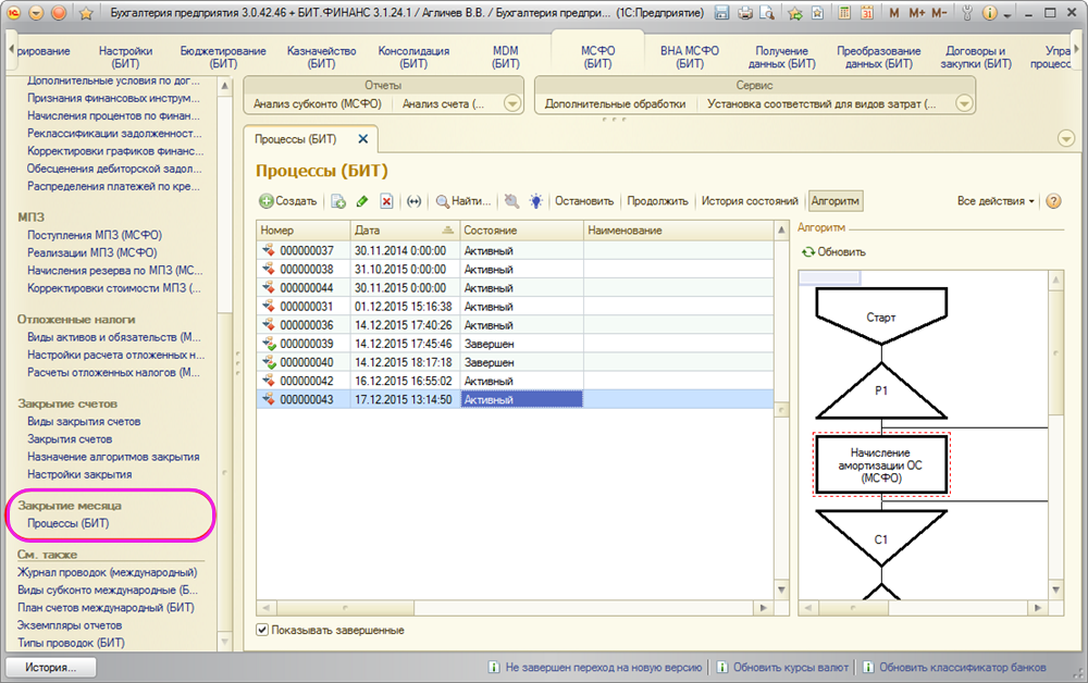 В раздел «МСФО (БИТ)» добавлен подраздел «Закрытие месяца», куда выведен журнал «Процессы (БИТ)»: