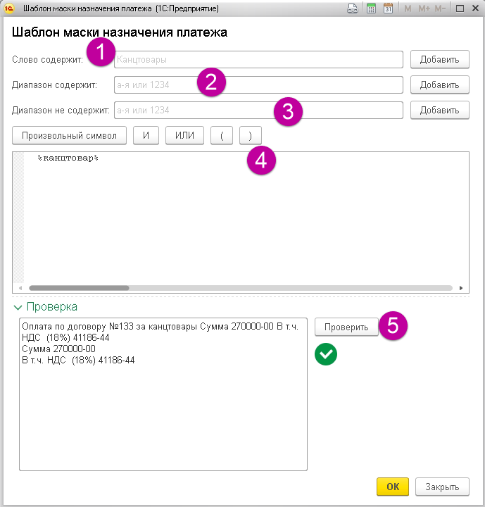 5. «Проверка» - простой механизм проверки, который позволяет проверять созданные шаблоны маски назначения платежа на любых примерах, с помощью кнопки «Проверить».