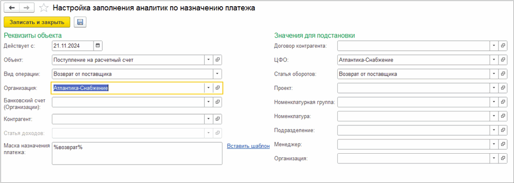 4. «Реквизиты объекта» - Организация, Банковский счет организации, Контрагент, Статья расходов/доходов - значения, указанные в реквизитах объектов, при которых будет применять данная настройка.